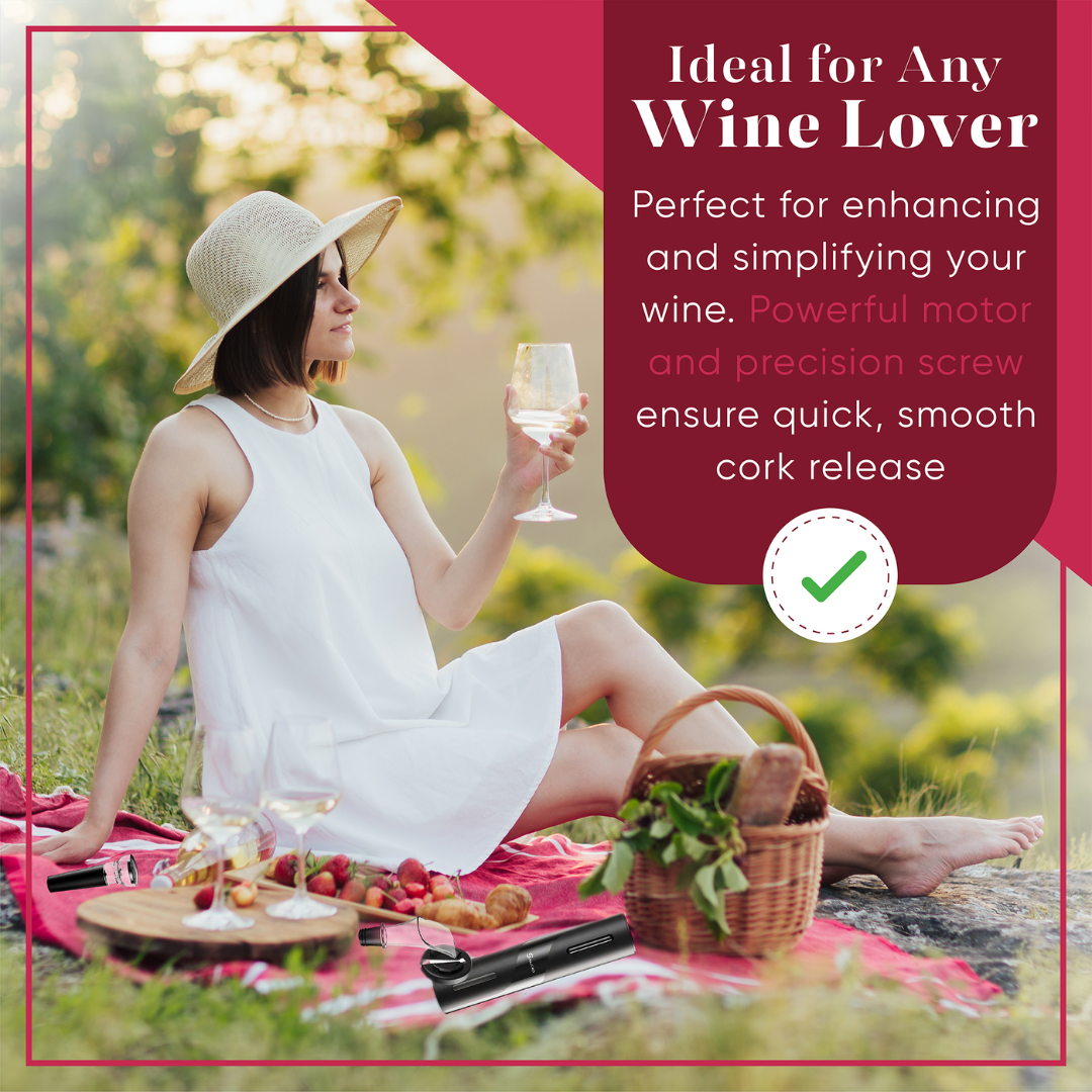 Elevate your wine experience with our 4-in-1 deluxe wine opener set, designed for wine lovers. Alongside our indispensable electric wine opener, you'll find a trio of essentials: a foil cutter for seamless foil removal, an aerator pourer to enrich your wine's flavor as you pour, and a vacuum stopper to preserve your wine's freshness after opening.